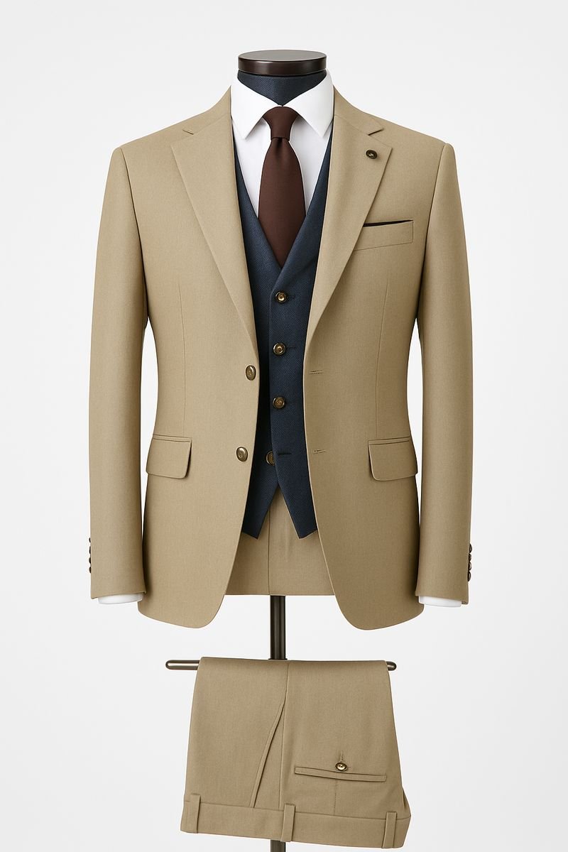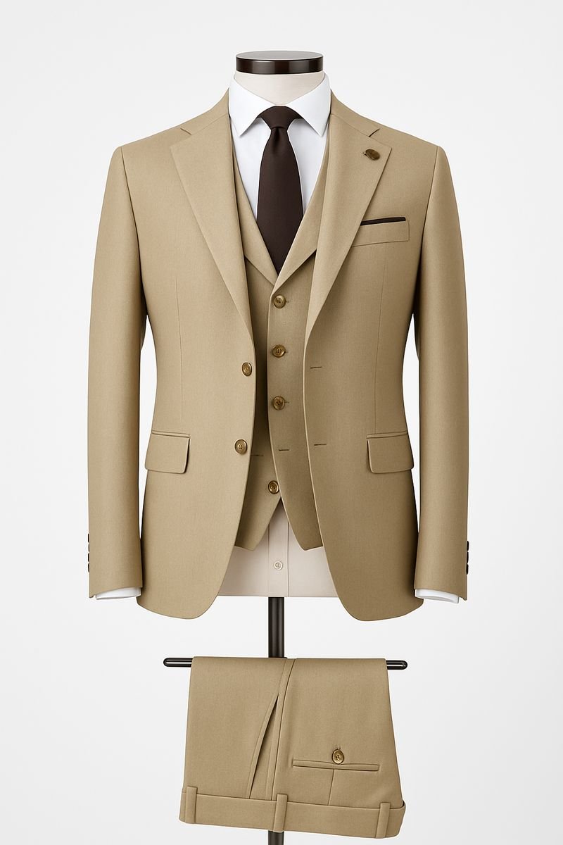This refined three-piece suit is tailored for a clean, confident, and modern appearance. The single-breasted jacket features a structured fit with smooth lapels that enhance a sharp silhouette. A matching waistcoat adds depth and elegance, while the coordinated trousers complete a polished, well-balanced look. Displayed on a mannequin against a white background, the suit highlights precise tailoring, neat stitching, and a premium finish. Ideal for formal events, business wear, weddings, and special occasions, this suit offers a timeless style with a professional and sophisticated appeal.