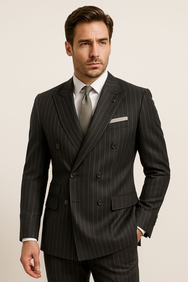 This elegant double-breasted suit is tailored for a bold and sophisticated appearance. Featuring a refined vertical stripe pattern, the structured jacket is designed with sharp lapels that enhance a confident silhouette. The coordinated trousers complete a clean and polished look, while the overall tailoring highlights precision and premium craftsmanship. Presented on a mannequin against a white background, the suit reflects a modern yet timeless style. Ideal for formal occasions, business wear, weddings, and evening events, this suit delivers a professional, powerful, and stylish presence.